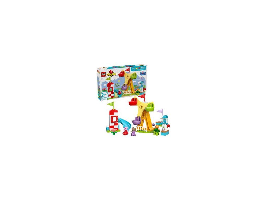 Táto stavebnica prenajmenších obsahuje 3 figúrky LEGO® DUPLO: Prasiatko Peppu, psa Danyho a mačku Máňu, a navyše otáčajúce sa ruské koleso, šmýkačku a džúsový bar