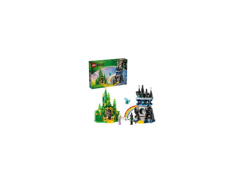 Model Emerald City a zámok Kiamo Ko obsahuje 2 hračkárske stavebnice s minibábikami Elphaby a Glindy LEGO Wicked, ako aj lietajúcou figúrkou opice a zostaviteľnou dúhou