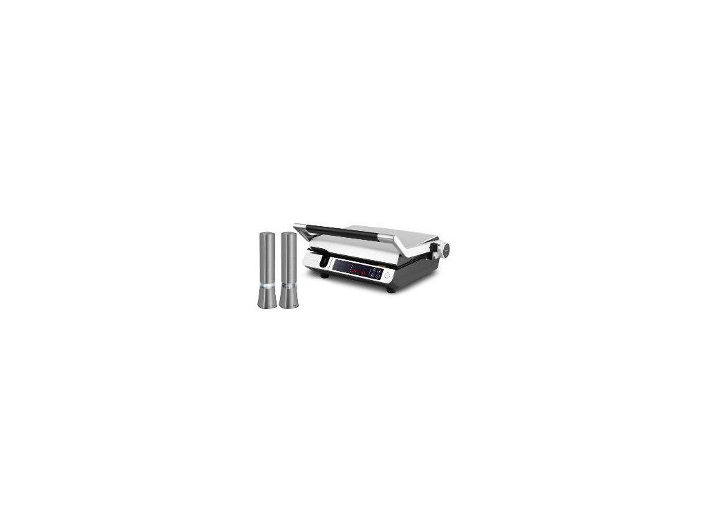 SMART GRIL 2 V 1, kombinácia BBQ a kontaktného grilu, teplotná sonda, nastaviteľná výška hornej dosky, veľký dotykový displej, vyberateľná nádoba na šťavu, 6 programov. Horná doska grilu je výškovo nastaviteľná a pomocou tlačidla ľahko premeníte kontaktný gril na otvorený, BBQ gril. Na dosiahnutie vždy perfektných výsledkov je gril vybavený teplotnou sondou a doskami s viacvrstvovým povrchom. Robustné hliníkové telo je veľmi odolné a taktiež jednoduché na údržbu. Požadované funkcie grilu a čas sledujetena veľkom a dobre čitateľnom displeji. Vybrať si môžete zo 6 programov pre rôzne druhy jedál. Po grilovaní stačí vybrať dosky a zásobník na šťavu, umyť a gril zamknúť do polohy pre horizontálne skladovanie, čím ušetríte aj priestor. + Mlynčeky na soľ a korenie Jednoduché ovládanie tlačidlom Keramické mlecie kamene Možnosť nastavenia hrúbky mletia Napájanie: 12x AAA batériaDodatočné parametre