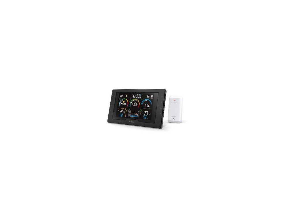 Spolu so stanicou dostanete bezdrôtový senzor s dosahom až 30 metrov. Pre prehľad o vývoji počasia je k dispozícii ukladanie maximálnych a minimálnych hodnôt a tiež funkcia výstrahy pri poľadovici. Displej zobrazuje aktuálny čas, dátum, mesačnú fázu a deň v týždni. O presnosť sa starajú rádiom riadené hodiny, ktoré je možné v prípade potreby nastaviť aj ručne. Stanicu je možné postaviť alebo pripevniť na stenu. Napájanie zaisťuje sieťový adaptér (v balení). Dostanete aj 1 záložnú batériu hlavnej jednotky. Vonkajší senzor vyžaduje dve ceruzkové batérie AA (1,5 V), ktoré nie sú súčasťou balenia – ideálne sú nenabíjacie lítiové."