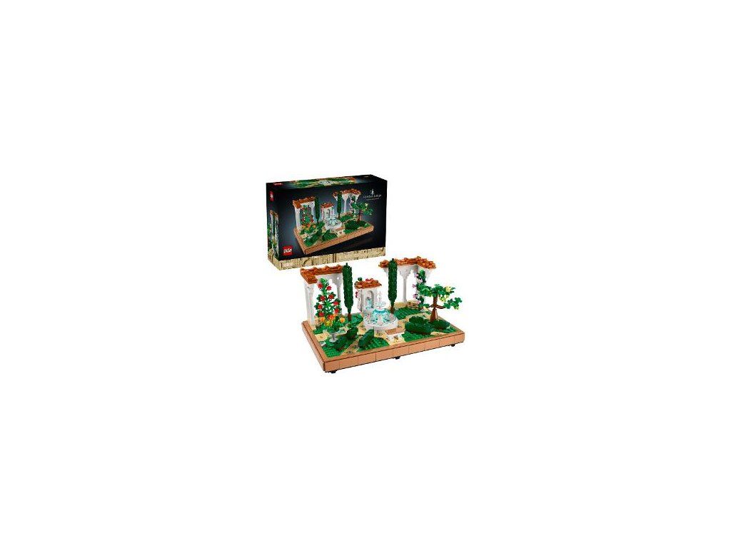 LEGO® Záhrada s fontánou obsahuje stupňovitú fontánu, lavabo, 2 cyprusy, kvitnúcu vínnu révu, 4 pergolya dláždené cestičky a figúrku mory, vtáka a žaby